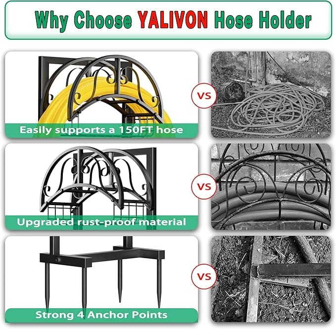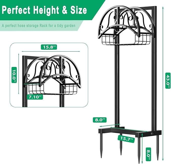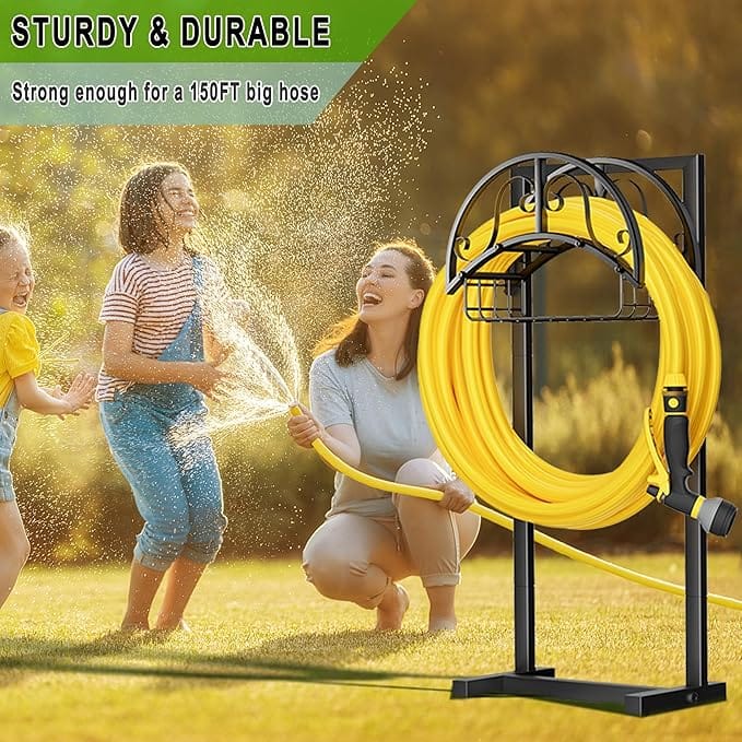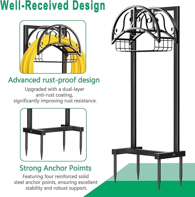 Die stabile Metallkonstruktion ist für den Einsatz im Garten, auf der Terrasse oder im Hof geeignet. Durch das freistehende Design kann der Schlauchhalter flexibel positioniert werden, ohne an der Wand montiert zu werden.