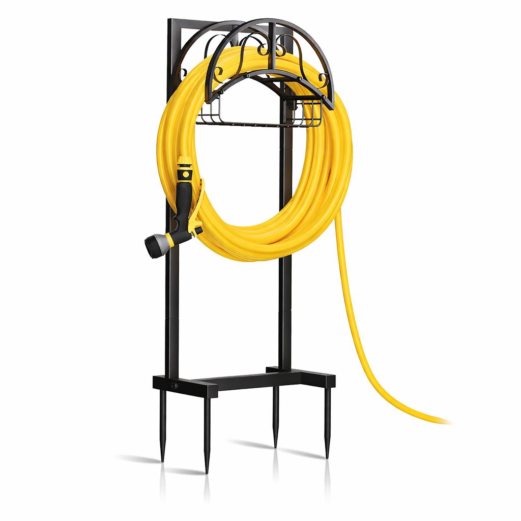 Dieser freistehende Gartenschlauchhalter aus Metall dient zur ordentlichen und platzsparenden Aufbewahrung von Wasserschläuchen im Außenbereich.